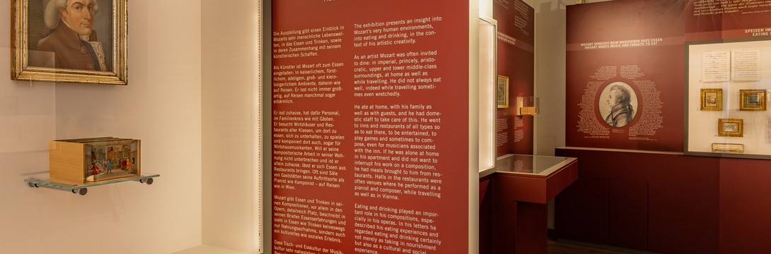 Visitors can discover, with Mozart’s help, that table manners and eating habits are very closely related to musical culture, and perhaps they can even reflect on their own experiences. The exhibition is based strictly on facts and documents, mainly letters and musical notation. Legends, for instance, concerning the restaurants Mozart allegedly frequented or his apparent favourite dishes are not to be found here. What we know about and from Mozart’s dining experiences, eating and drinking habits, is related to comparable contemporaneous pictorial and text sources so as to present a vivid image for visitors, and to portray Mozart as a child of his time.